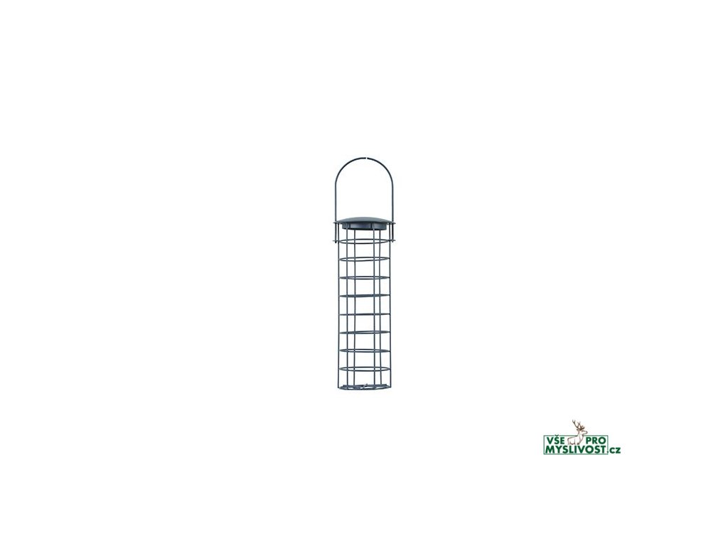 Závěsné kovové krmítko na 4 lojové koule, se stříškou. Dodáváno bez koulí.