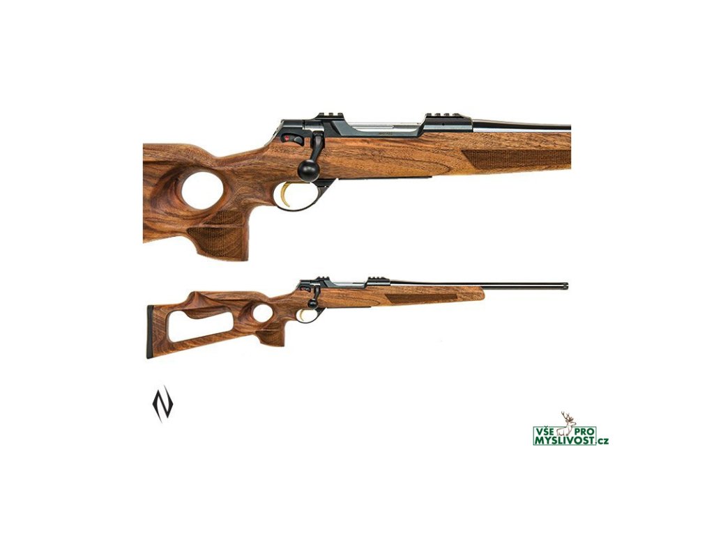 Precizní kulovnice se špičkovým beddingem v dřevěné, anatomické pažbě s otvorem pro palec tzv. Thumbhole, stavitelná spoušť 400g - 1 550g