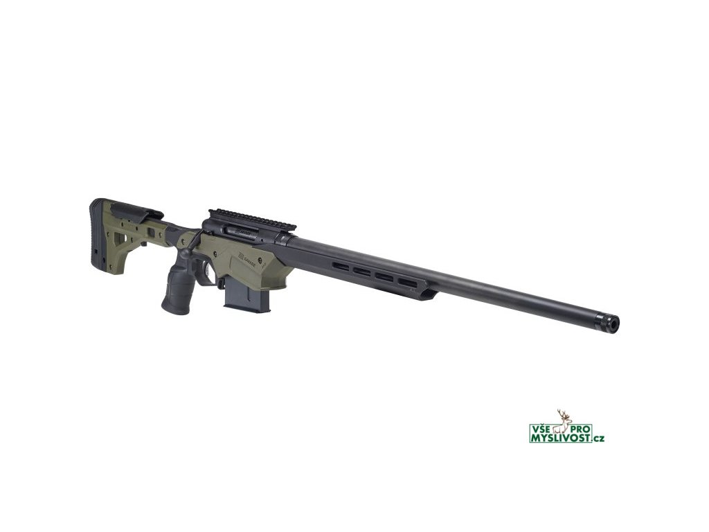 Populární kulovnice AXIS II v terčovém provedení se stavitelným pažbením od MDT Chassis s M-LOK předpažbím, tečovou hlavní se závitem, stavitelnou spouští Accutrigger a odnímatelným zásobníkem kompatibilním s Accuracy International, základna montáže typu Wever/Picatinny s náklonem 20 MOA, závit na hlavni 1/2"-28"