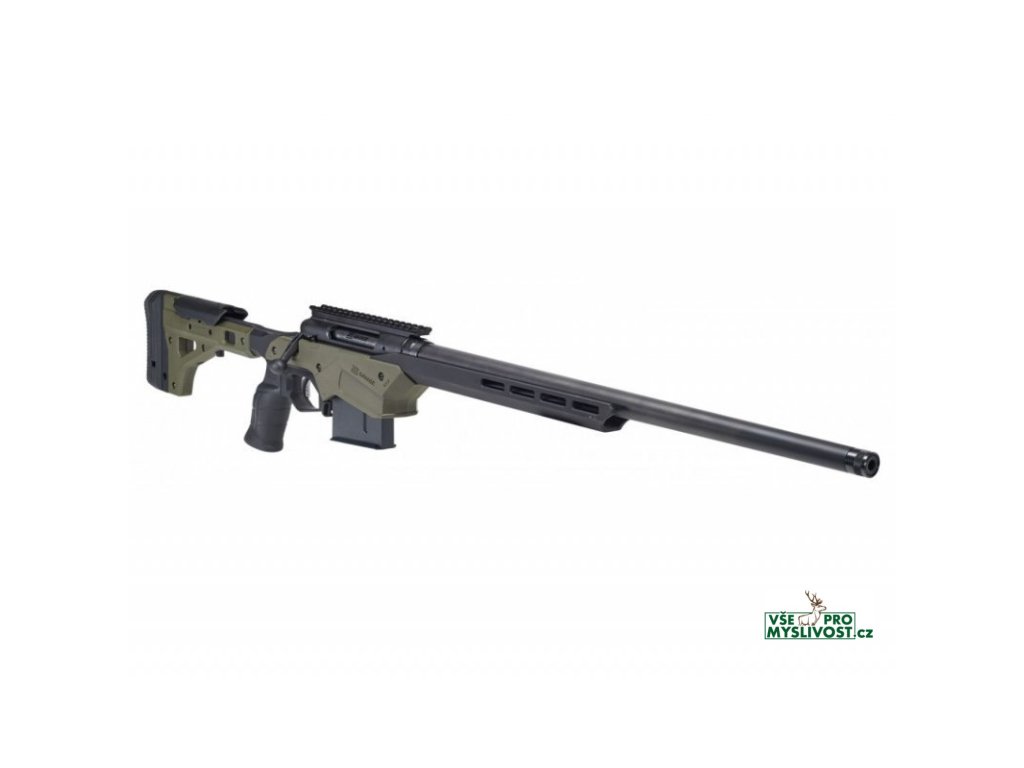 Populární kulovnice AXIS II v terčovém provedení se stavitelným pažbením od MDT Chassis s M-LOK předpažbím, tečovou hlavní se závitem, stavitelnou spouští Accutrigger a odnímatelným zásobníkem kompatibilním s Accuracy International, základna montáže typu Wever/Picatinny s náklonem 20 MOA, závit na hlavni 5/8"-24