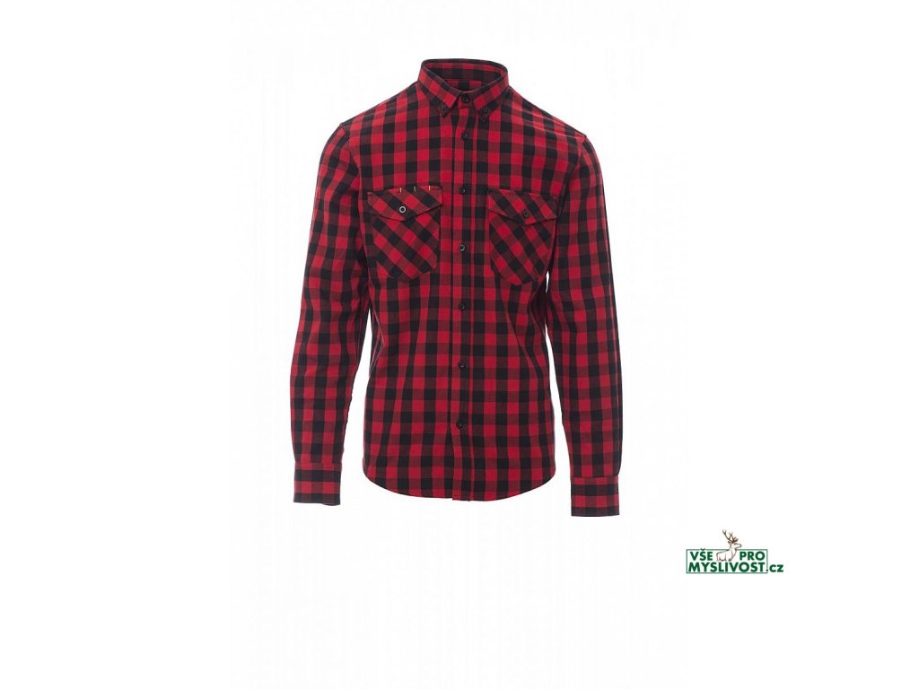 Skotská košile s dlouhým rukávem s perleťovými knoflíky, anglický propínací límeček, sedlo na zadní straně, dvě kapsy na hrudi s klopou na knoflík a kapsičkou na tužku.