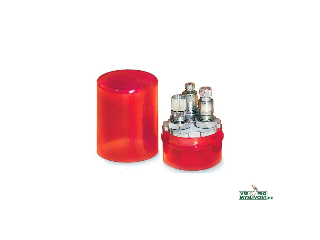 Krabička pojme 4 matrice. Pokud otočíte spodní víko, slouží jako stojan na tří-děrovou hlavu lisu s matricemi.