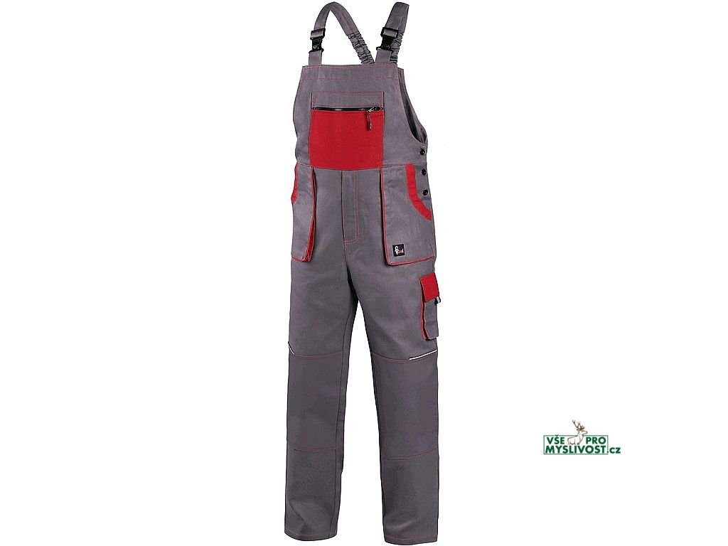 Pánské montérkové kalhoty s náprsenkou, náprsní kapsa na zip, pas vzadu do gumy, přední kapsy, boční kapsa na svinovací / skládací metr, boční kapsa na mobil / peněženku, zdvojená kolena, zadní kapsa s klopou, šle s gumou vzadu, reflexní doplňky. Doporučené použití: stavebnictví, lehký průmysl, logistika, skladová manipulace, autoservisy, údržba, montáže, zemědělství, zahrada, hobby.