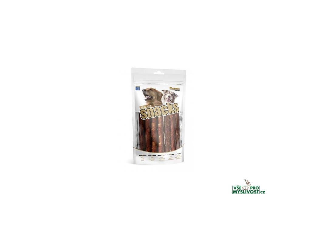 Přírodní masová pochoutka pro psy - tyčka z hovězí kůže obtočená plátkem lahodného kachního masaSlouží jako odměna při hře, výcviku nebo jako doplněk stravy při cestách.