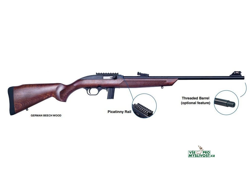Nová varianta oblíbené samonabíjecí malorážky Rossi s dřevěnou pažbou, závitem na hlavni 1/2"-28, stavitelnými mířidly a základnou montáže pro puškohled