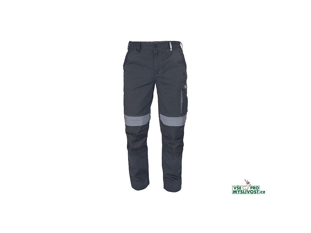 • pánské pracovní kalhoty s elastickým pasem • 2 přední kapsy • 1 levá stehenní kapsa • 2 zadní kapsy se zapínáním na suchý zip • zesílená oblast kolen s možností vložení chráničů kolen • reflexní prvky • nastavitelná délka nohavic