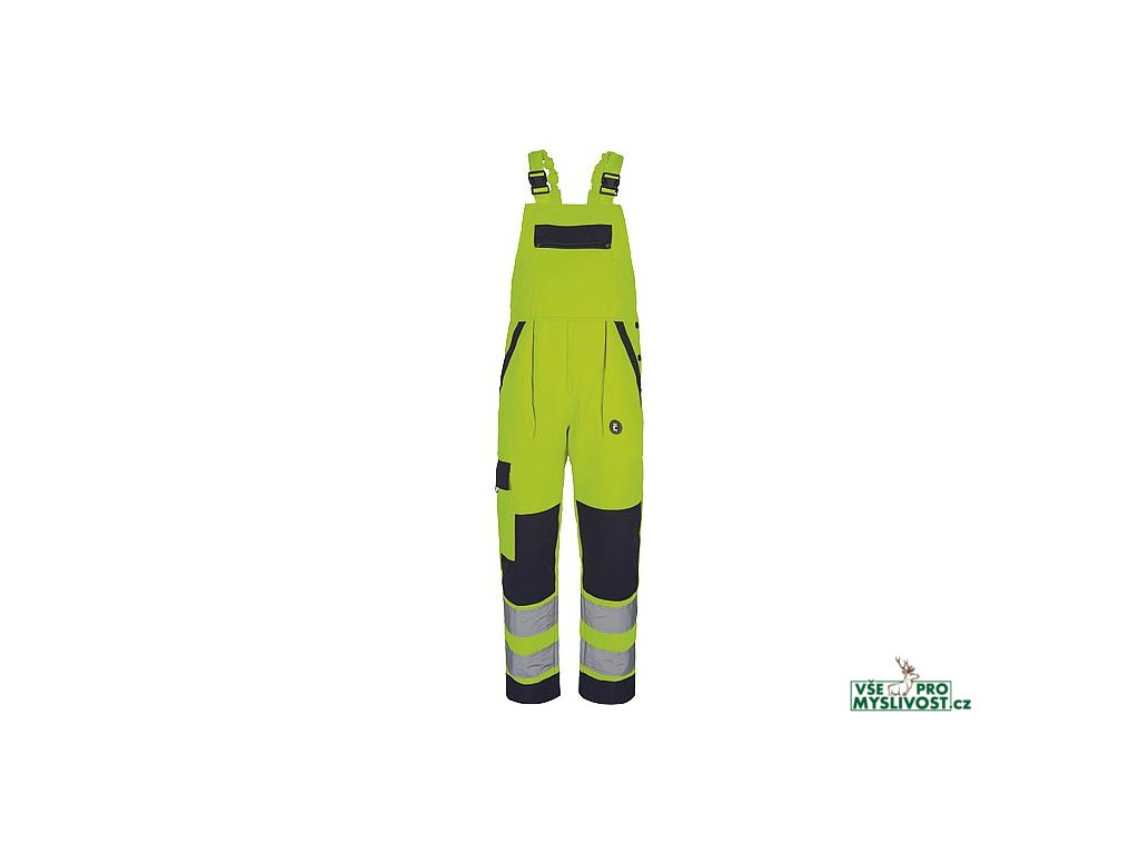 • pánské HI-VIS pracovní laclové kalhoty s elastickým pasem • 2 přední kapsy • 1 stehenní kapsa • 1 velká náprsní kapsa se zapínáním na zip • 2 zadní kapsy se zapínáním na suchý zip • 2 šité 7,5 cm široké reflexní pruhy na spodních částech nohavic • zesílená oblast kolen • nastavitelná délka nohavic