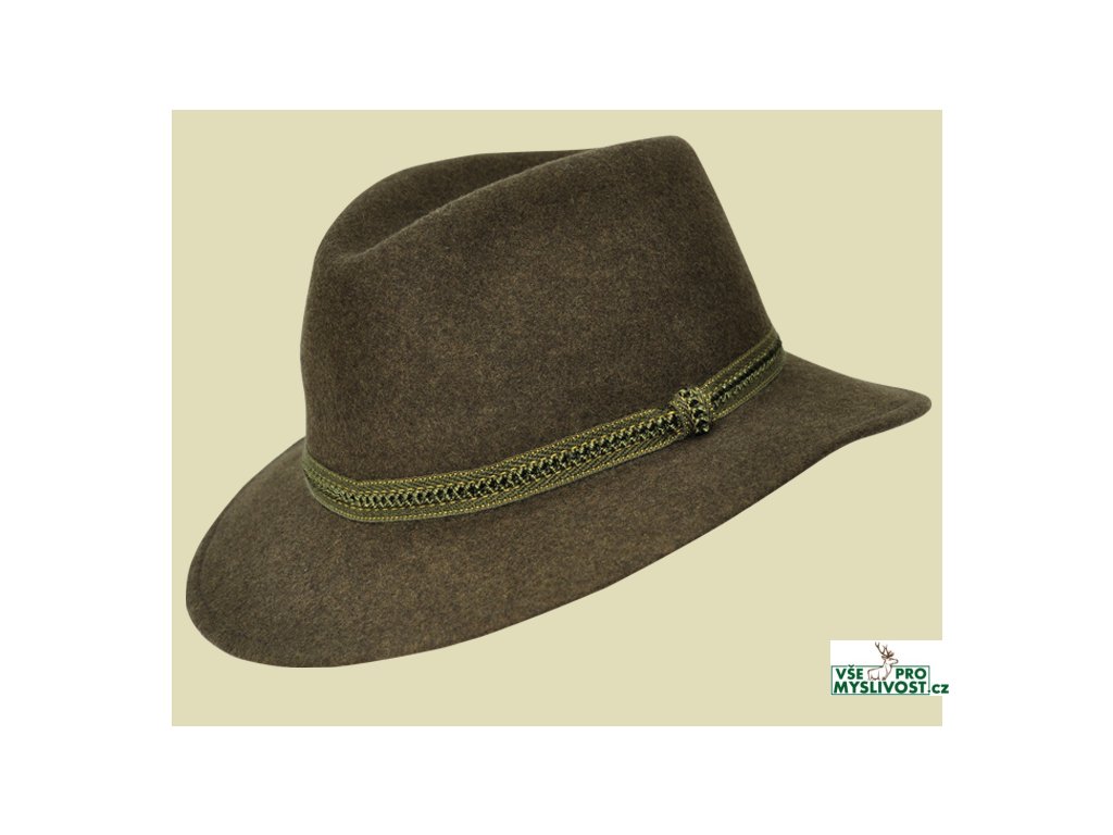 Pánský myslivecký klobouk Erik, vhodný pro děti, vyroben ze 100% vlněné plsti, se speciální úpravou "do kapsy", zdobený bavlněnou stuhou. Klobouk je vybaven textilním potním páskem Werra Hunting.