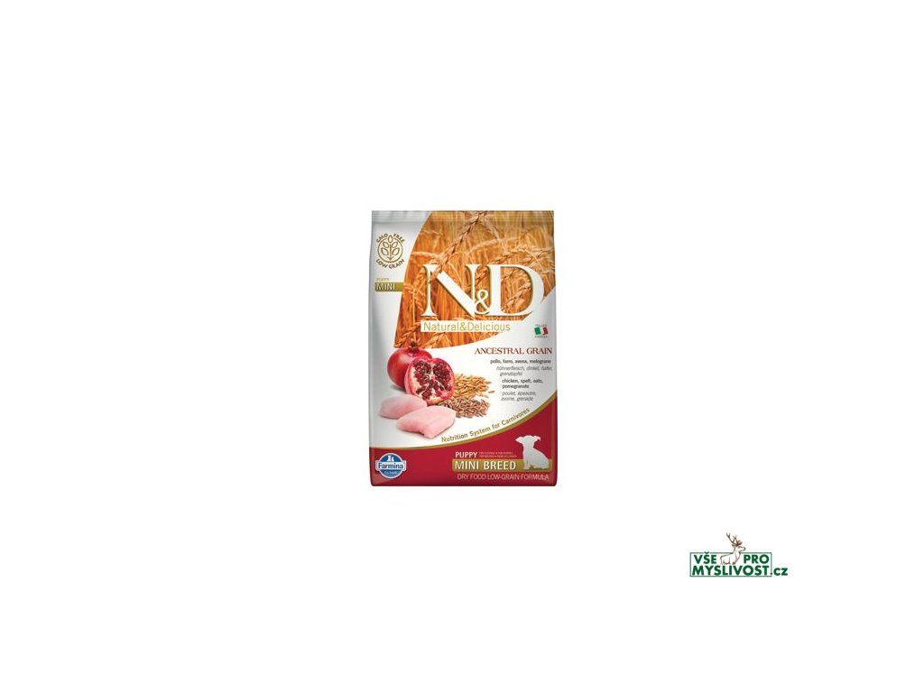 N&D Low Grain Chicken & Pomegranate Puppy Mini DogKuře, špalda, oves a granátové jablko.