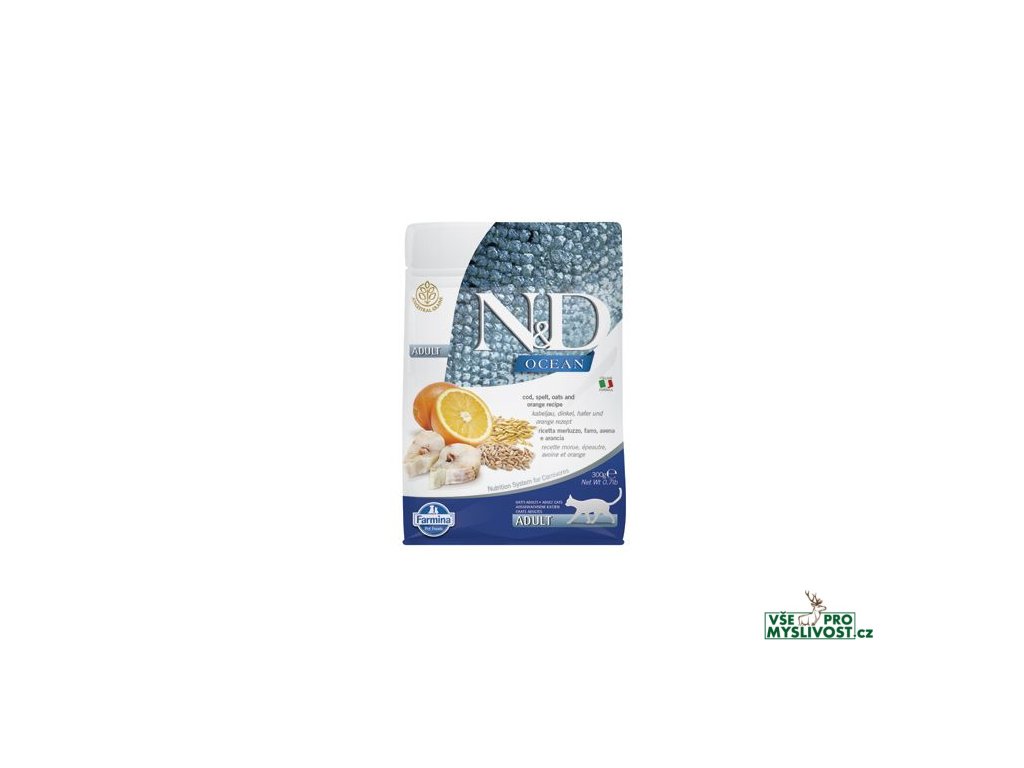 N&D OCEAN Low Grain Codfish & Orange Adult CatTreska, špalda, oves a pomeranč.