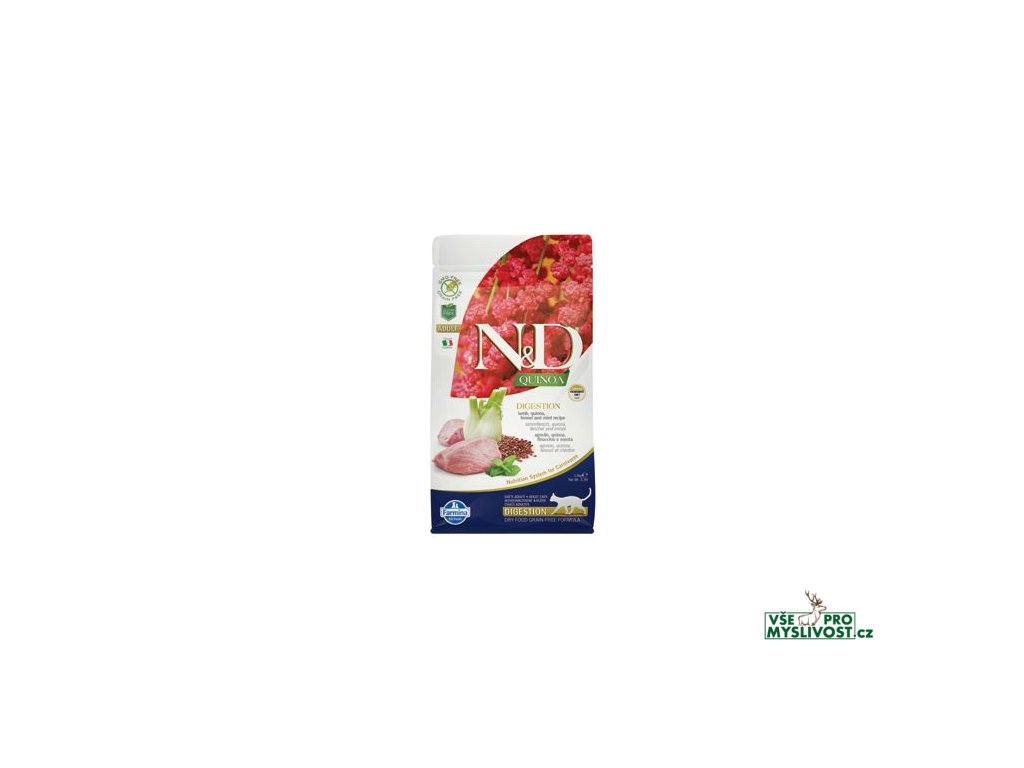 Farmina N&D Quinoa Digestion je krmivo pro zvláštní účely výživy koček určené k podpoře kompenzace maldigesce a exokrinní pankreatické nedostatečnosti.