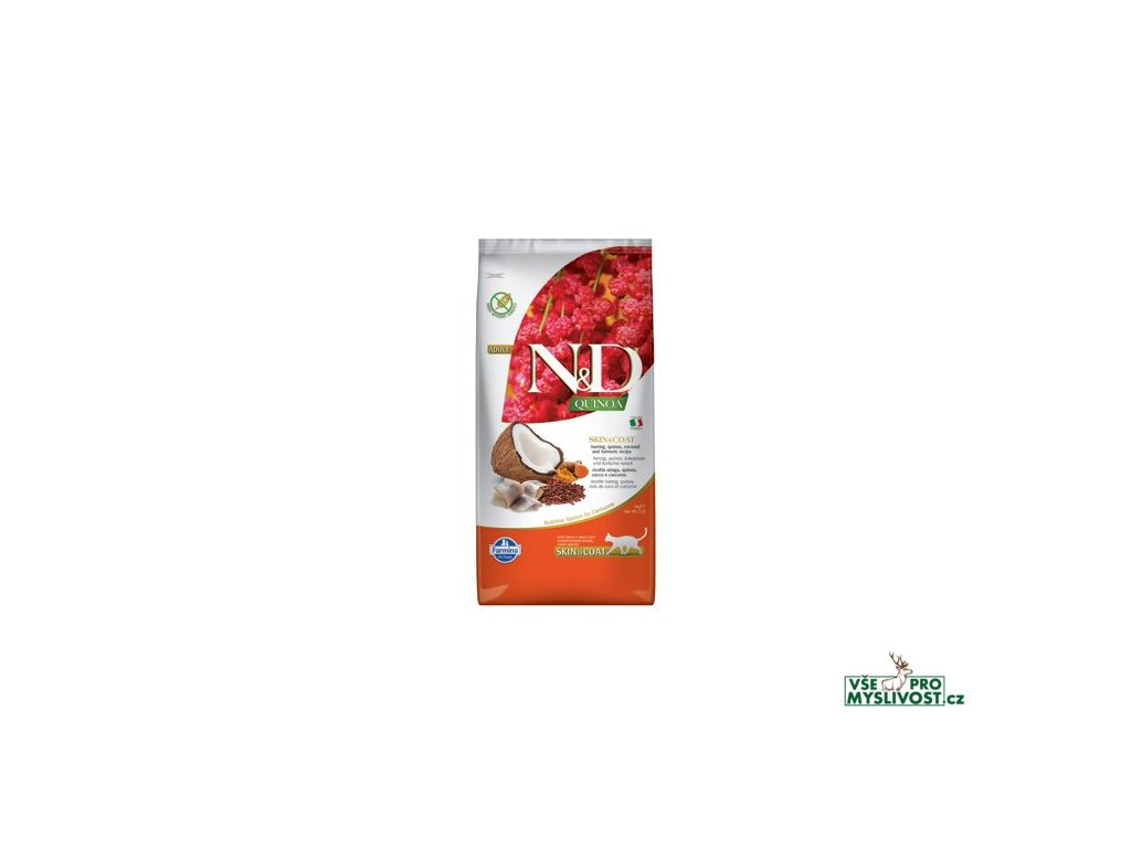 N&D Quinoa SKIN & COATSleď, quinoa, kokos, kurkuma. Kompletní vyvážené krmivo pro dospělé kočky.
