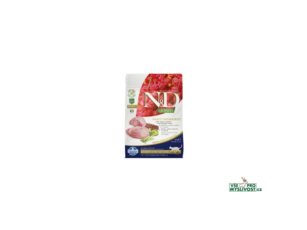 N&D Quinoa WEIGHT MANAGEMENTJehně, quinoa, brokolice, chřest. Kompletní vyvážené krmivo pro dospělé kočky.