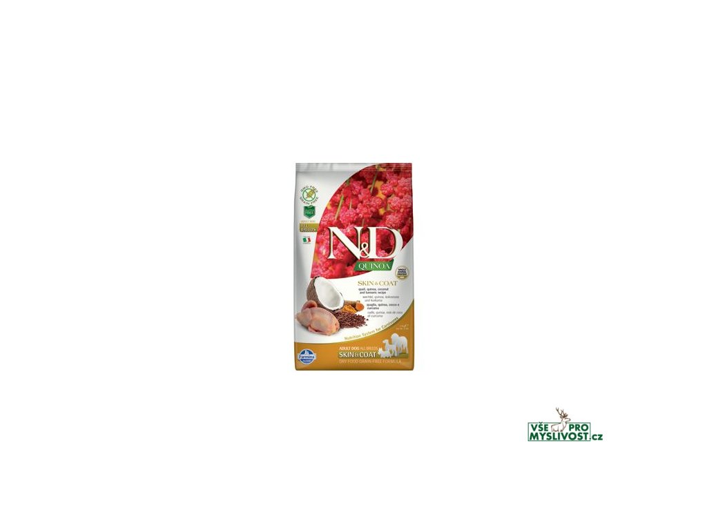 N&D Quinoa SKIN & COATKřepelka, quinoa, kokos, kurkuma. Kompletní vyvážené krmivo pro dospělé psy.