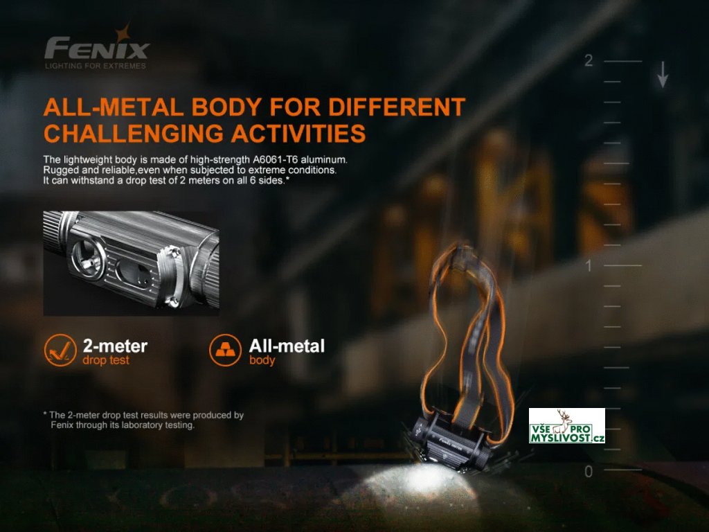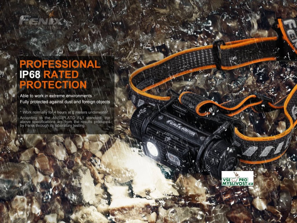 Konstrukce z lehké hliníkové slitiny zajišťuje vysokou odolnost, optimální chlazení a zároveň je plně vodotěsná dle standardu IP68 až do hloubky 2 metry pod vodou. Čelová svítilna Fenix HM70R je výbornou volbou pro všechny, kteří požadují špičkový výkon a extrémní výdrž baterie. Ocení jí určitě cyklisté, speleologové, horští vůdci, skialpinisté, horolezci, záchranáři, ale třeba i pracovníci v průmyslových odvětvích a běžní turisté nebo rybáři.