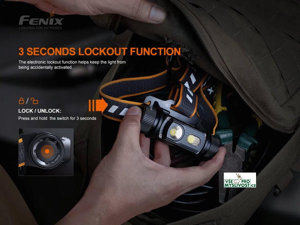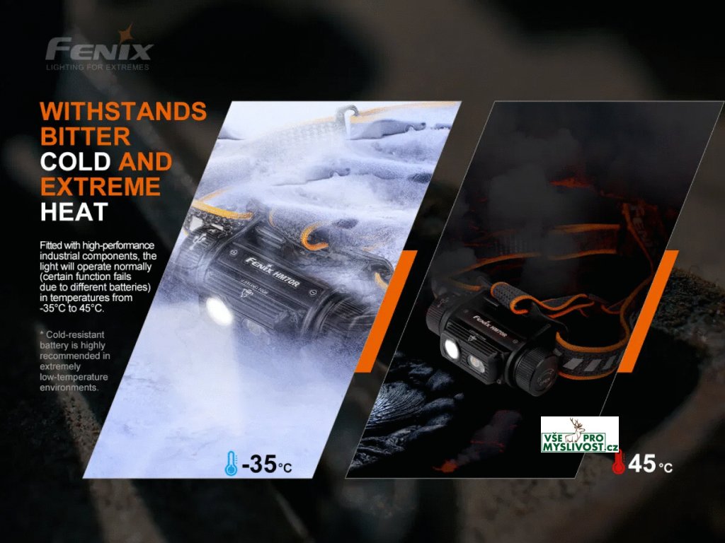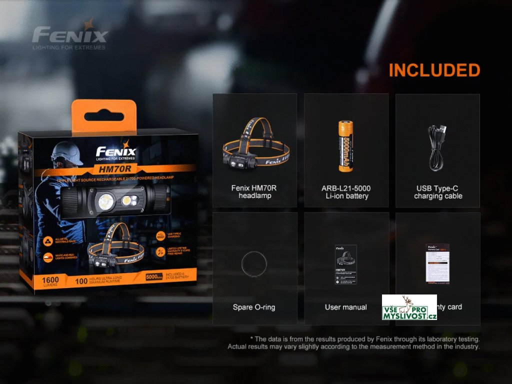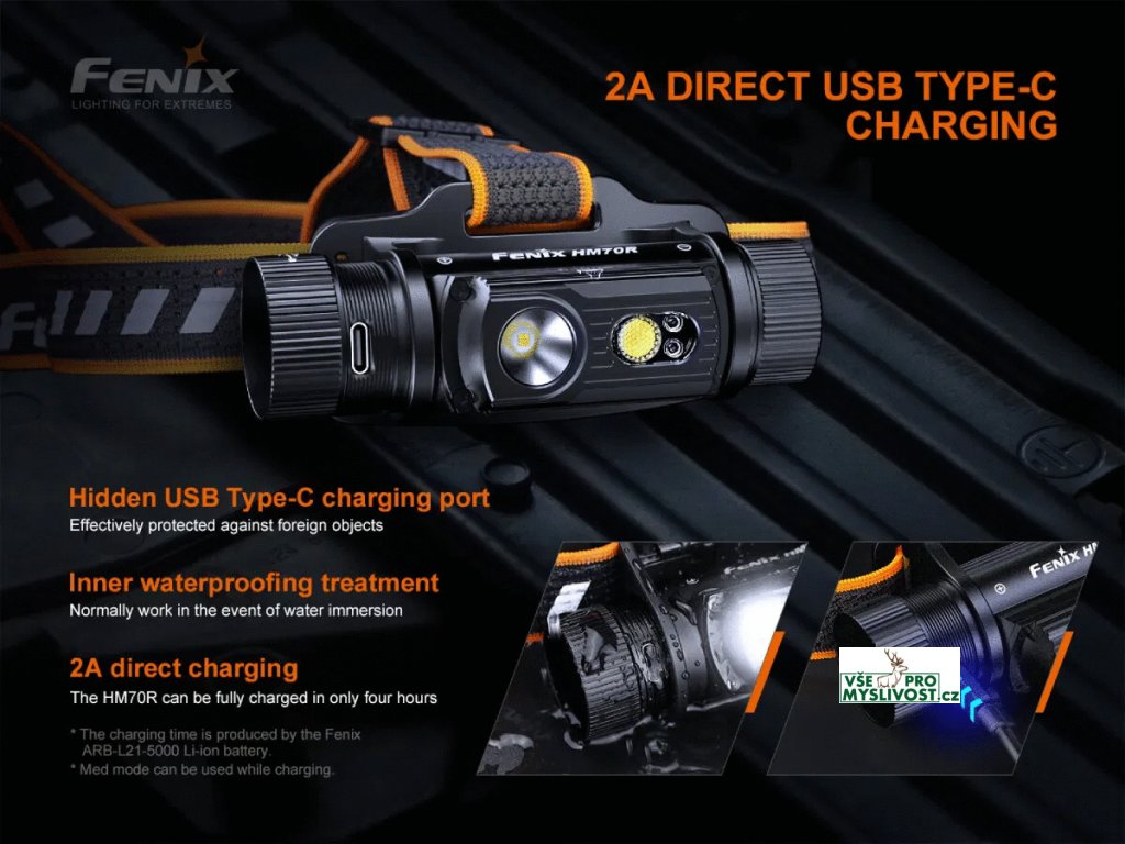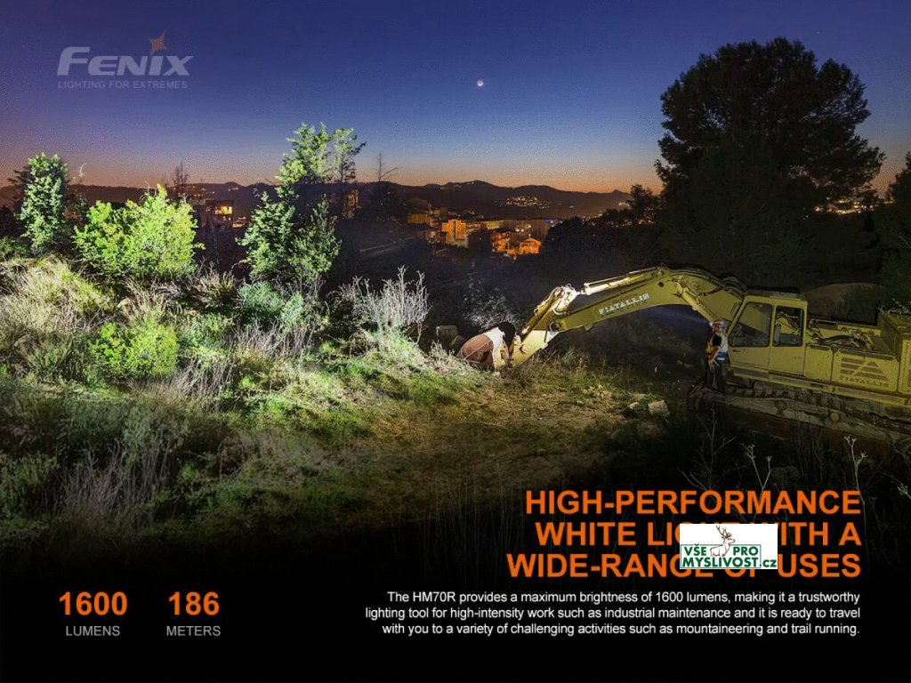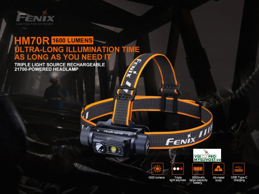Fenix HM70R je extrémně výkonná nabíjecí čelovka, která nabízí světelný tok až 1600 lumenů. Součástí balení je i nabíjecí Li-ion akumulátor typu 21700 s kapacitou 5000 mAh, který se nabíjí přímo v čelovce přes USB-C konektor. Čelovka je osazena více světelnými zdroji, v dálkovém reflektoru se nachází LED Luminus SST-40, která dosvítí až na vzdálenost 186 metrů. V druhém širokém reflektoru je osazena LED Cree XP-G2 HE s teplejším odstínem (neutral white) o výkonu 400 lumenů, která má světelnou stopu velmi širokou a plynulou. Čelovka disponuje navíc i červeným světlem s výkonem 5 lumenů. S touto barvou je schopna svítit na nejnižší režim téměř 17 dní a dovede nepřetržitě blikat přes 33 dní.