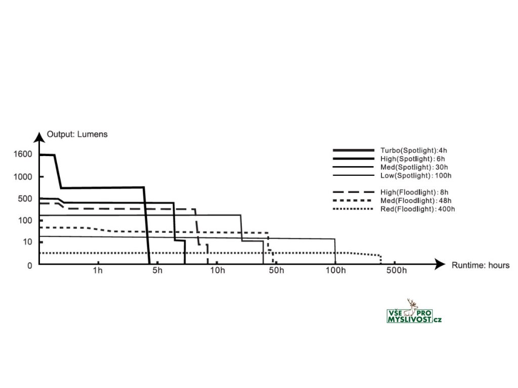 - Dálkový reflektor: 1600 lumenů (4 hodiny) -> 500 lumenů (6 hodin) -> 150 lumenů (30 hodin) -> 30 lumenů (100 hodin).