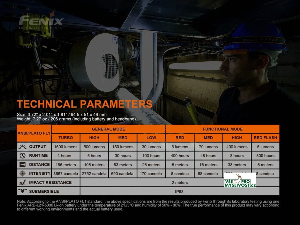 Všechny parametry svítilny (světelný tok, doba provozu na baterie, vodotěsnost, dosvit a nárazuvzdornost) jsou změřeny v souladu s normou ANSI/NEMA FL 1-2009.
