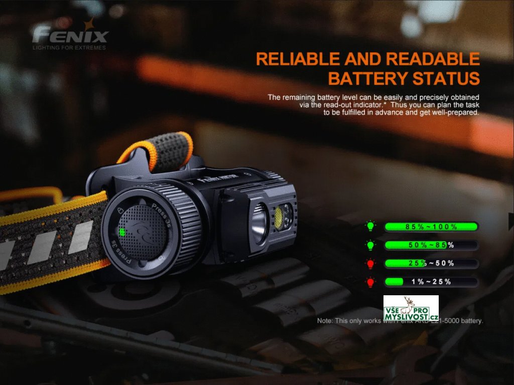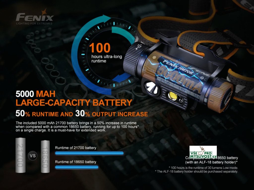 - Součástí balení je čelovka, akumulátor Fenix 21700 5000 mAh, USB kabel, popruhy na hlavu a náhradní o-kroužek.