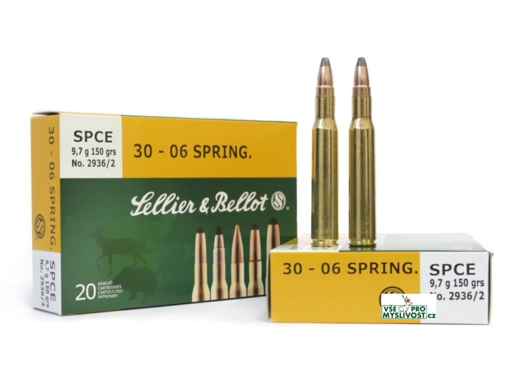 SB 30-06 Spr 2936 SPCE 9,7g Poloplášťová střela s prosekávací hranou. Střela má na plášti prosekávací hranu, která současně z části uzamyká olověné jádro. Účinek střely je závislý na odporu cíle, což způsobuje, že u slabší zvěře se střela deformuje méně než u silnější. Je vhodná k lovu spárkaté zvěře.