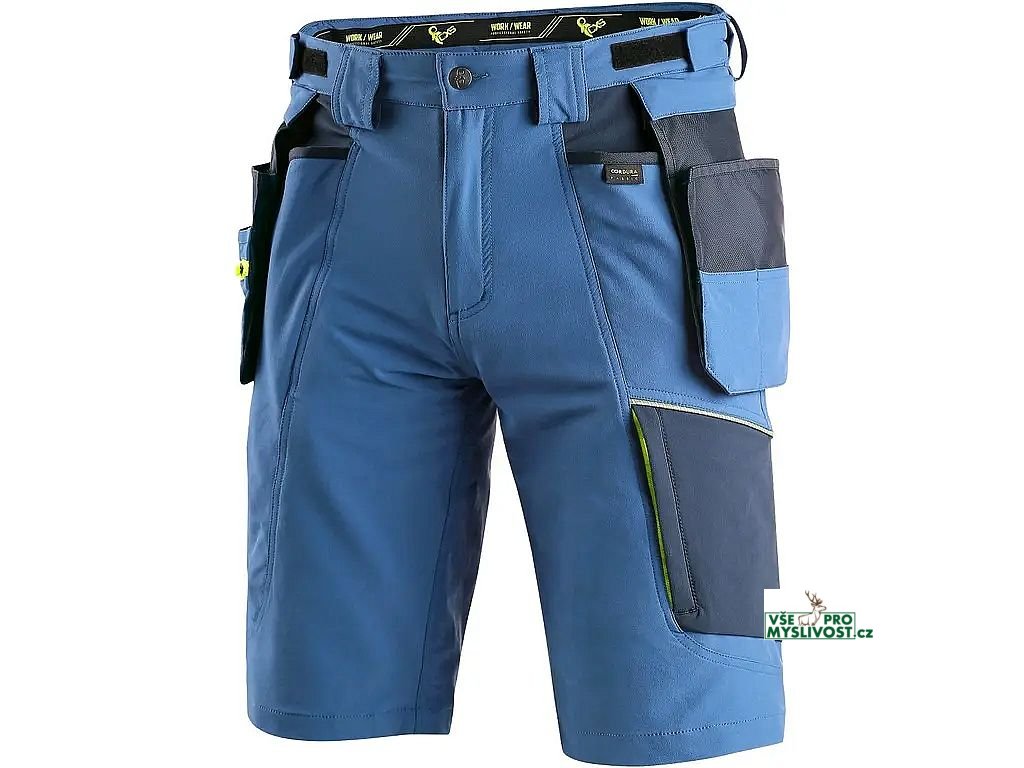 Pánské montérkové kraťasy s kontrastními barevnými a reflexními doplňky. Konstrukce 4-way stretch umožňuje roztahování materiálu ve všech čtyřech směrech a tím i snadný a volný pohyb. Vysoké procento nylonu zaručuje schopnost rychlého schnutí. Vybavení: flexibilní pas s možností upravení velikosti a poutky na opasek, 2 přední kapsy, 2 odnímatelné kapsy na nářadí vyztuženy materiálem CORDURA, kapsa na zip na stehně, multifunkční boční kapsa, 2 zadní kapsy ve spodní části vyztuženy materiálem CORDURA. Doporučené použití: letní pracovní oděv, strojírenství, stavebnictví, lehký průmysl, automobilový průmysl, logistika, skladování, spedice, autoservisy, údržba, montáže, zemědělství, zahrada, hobby a volný čas.