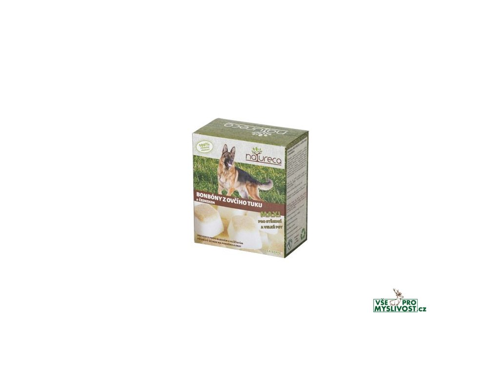 Originální bonbony z ovčího tuku s česnekem NATURECA jsou přírodním produktem podporujícím odolnost organismu proti parazitům (blechám a klíšťatům), zlepšují kvalitu pokožky a srsti, napomáhají trávení a podporují celkovou obranyschopnost organismu. Ovčí tuk je chutný doplněk stravy a je důležitý k přísunu vitamínů A, D, E a K v těle. Vhodné pro všechna plemena psů všech věkových katgorii.