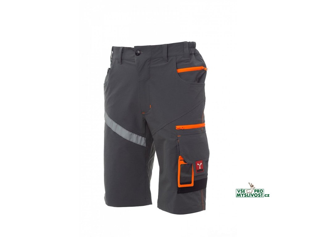 Unisexové bermudy, látka „4 way stretch“, gumičky na bocích a poutka na pásek v pase, zapínání na zip a přizpůsobený knoflík. Na přední straně kalhoty mají dvě zakulacené kapsy, na pravé straně kapsičku na mince a na levé straně bezpečnostní kapsičku na zip. Na přední straně levé nohavice jsou tři kapsy: vodorovná kapsa se zapínáním na zip, kapsa s tvarovanou klopou na suchý zip a pouzdrem na jmenovku, malá svislá kapsa se zapínáním na zip. Na přední straně pravé nohavice je reflexní páska. Na zadní straně je kapsa s malou klopou na suchý zip a kapsa bez klopy se 2 reflexními páskami, kapsička na kladivo (pravá nohavice), otevřená kapsička na svinovací metr (pravá nohavice) a kapsička na telefon s klopou na suchý zip (pravá nohavice). Boční prošívání a kontrastní výztuže na různých místech. Italské prostřední velikosti 48-50-52 mají vnitřní délku nohavic 31 cm.
