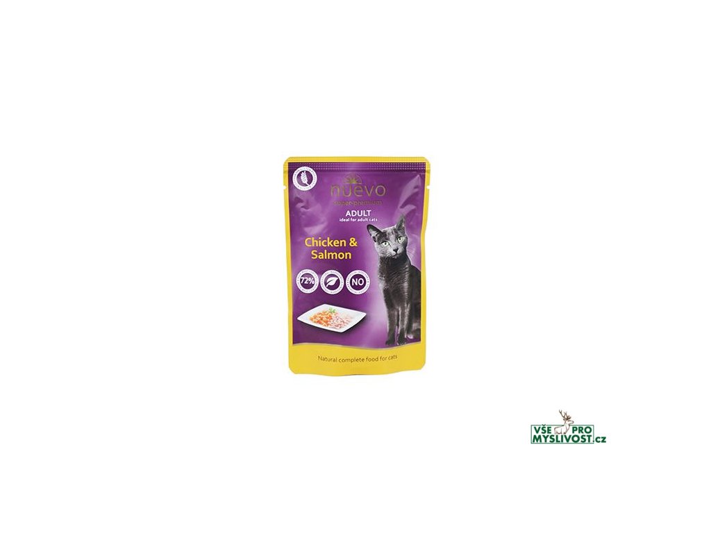Nuevo kočka adult kuře a losos kapsička je kompletní krmivo pro dospělé kočky všech plemen, obohacené o kuřecí a lososí maso. Toto krmivo se může pyšnit svojí kvalitou, kterou reprezentuje vysoký obsah masa a přírodních suroviny, naopak neobsahuje žádné umělé přísady, obilí a lepek.