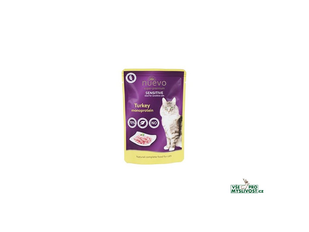 Krmivo Nuevo kočka sensitive Krůtí monoprotein je kompletní krmivo pro dospělé kočky všech plemen s citlivým zažíváním obohaceno o krůtí maso. Vysoký obsah masa a přírodních surovin, žádné umělé přísady, obiloviny či lepek dělají z tohoto krmiva opravdu vysoce kvalitní pochoutku, kterou si zamilují i ty nejvybíravější kočičky!