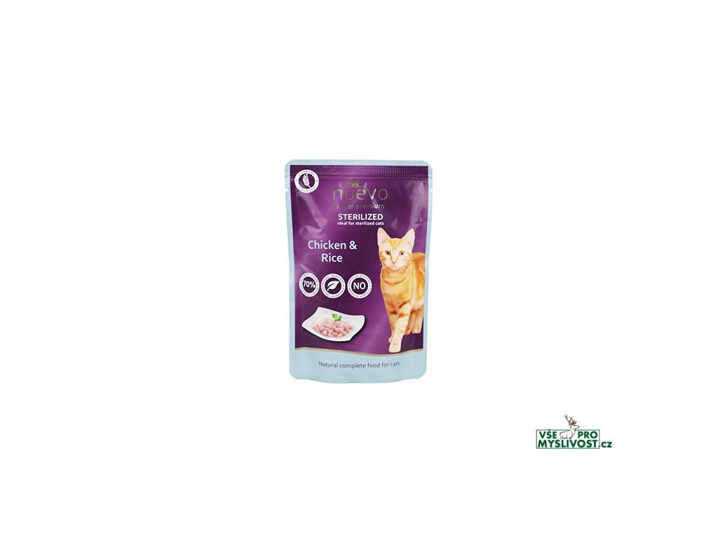 Krmivo Nuevo sterilized drůbeží s rýží je kompletní krmivo pro kastrované kočky všech plemen, obohaceno o drůbeží maso s rýží. Vysoký obsah masa a přírodních surovin, žádné umělé přísady, obiloviny či lepek dělají z tohoto krmiva opravdu vysoce kvalitní pochoutku, kterou si zamilují i ty nejvybíravější kočičky!