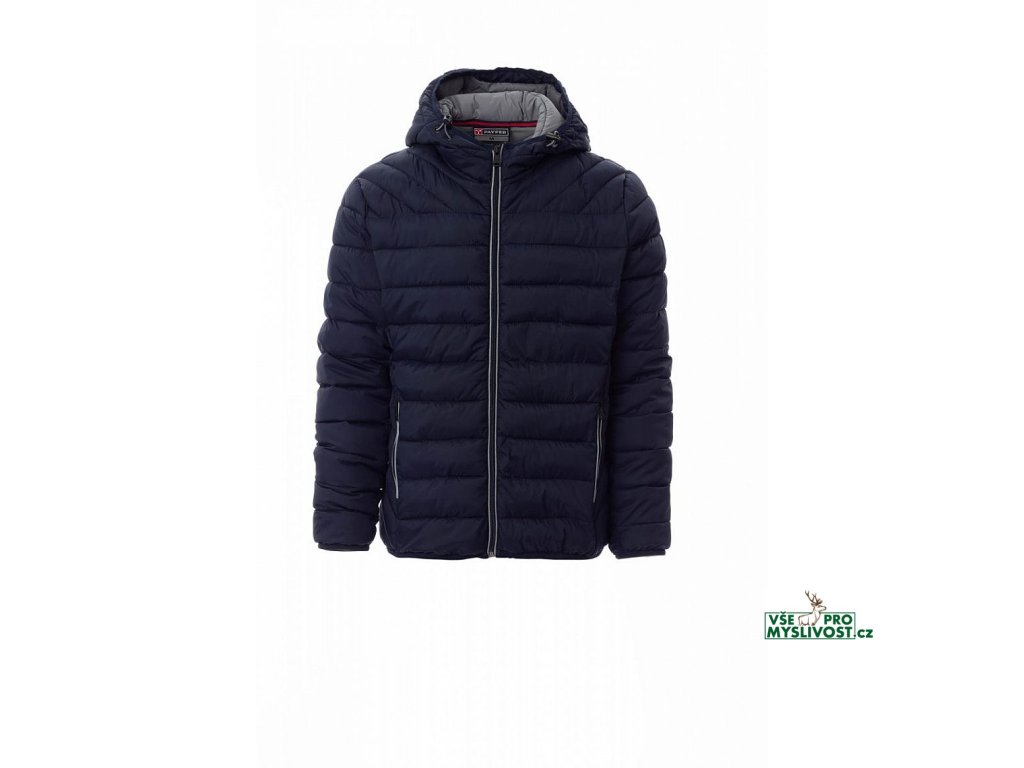 Pánská větrovka s kapucí, plastový 5mm zip s kovovým jezdcem, tenký lem na manžetách a v pase, dvě vnější kapsy. Vnitřek: polyesterové zateplení s efektem péřové náplně, dvě kapsy.