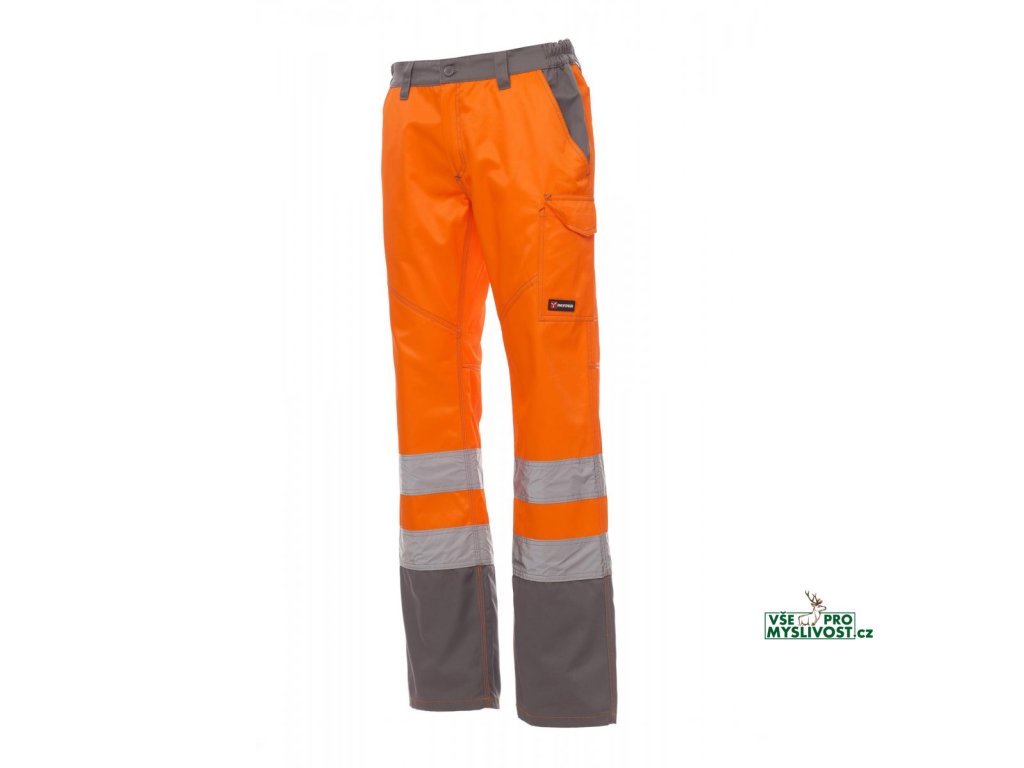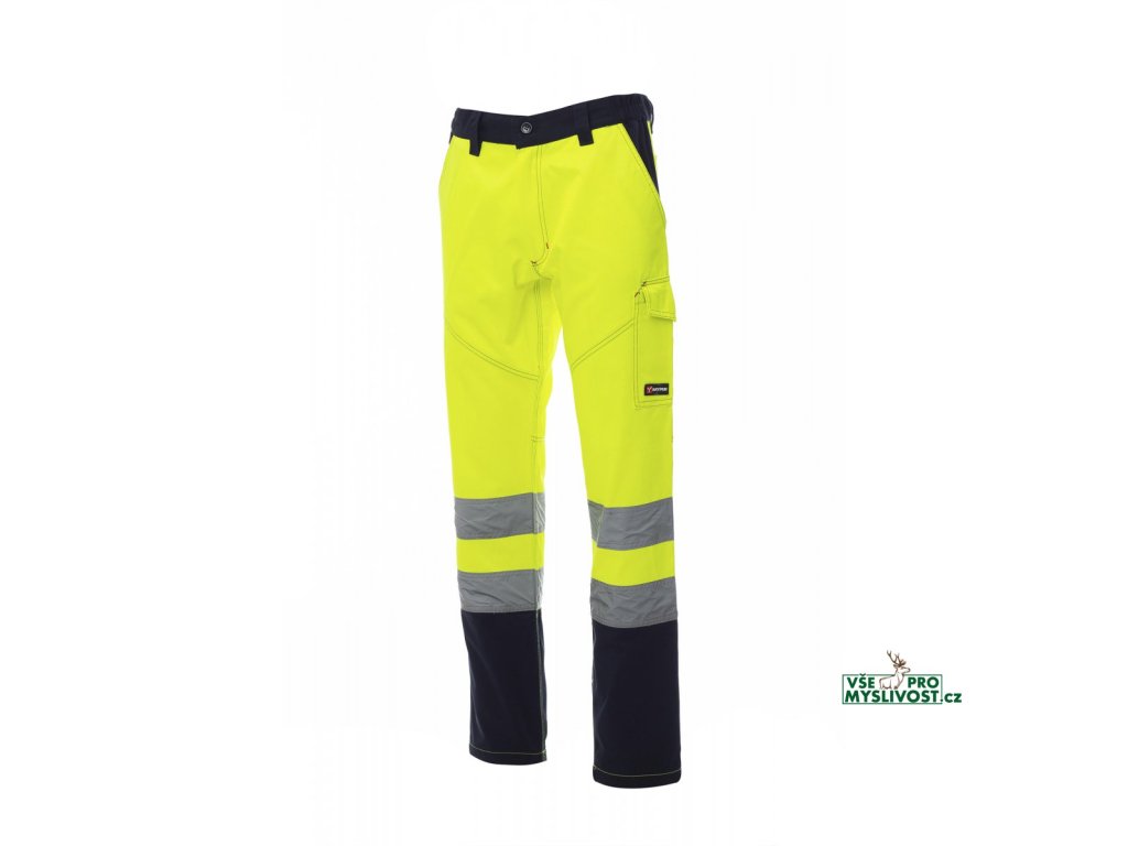 Pánské kalhoty, celoroční, s vysokou viditelností s reflexními pruhy, elastické pásky na bocích a poutka v pase, zapínání na plastový zip a na knoflík, dvě přední kapsy klasického střihu, jedna postranní kapsa LOCK SYSTEM, jedna kapsa na svinovací metr, dvě zadní kapsy, z nichž jedna otevřená a druhá s klopou na suchý zip. Kontrastní prošití, v rozkroku a na vnitřní straně nohavice s trojjehlovým prošitím.