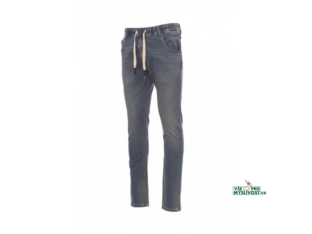 Pánské kalhoty džínového střihu, s pěti kapsami se zapínáním na kovový zip, stahovací šňůrka a poutka v pase, sepraný efekt, kontrastní odolné prošití, dvojité prošití na vnitřní straně nohavic, nohavice SLIM, cvočky a záplaty z pravé kůže. Hmotnost látky: 10,50oz/yd².