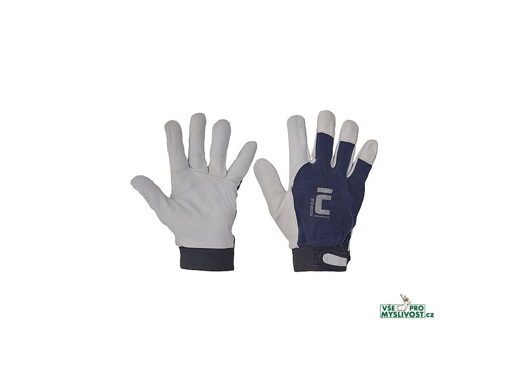 • rukavice šité z jemné lícové ovčiny v dlani • modré bavlněné tkaniny na hřbetu • manžeta na suchý zip