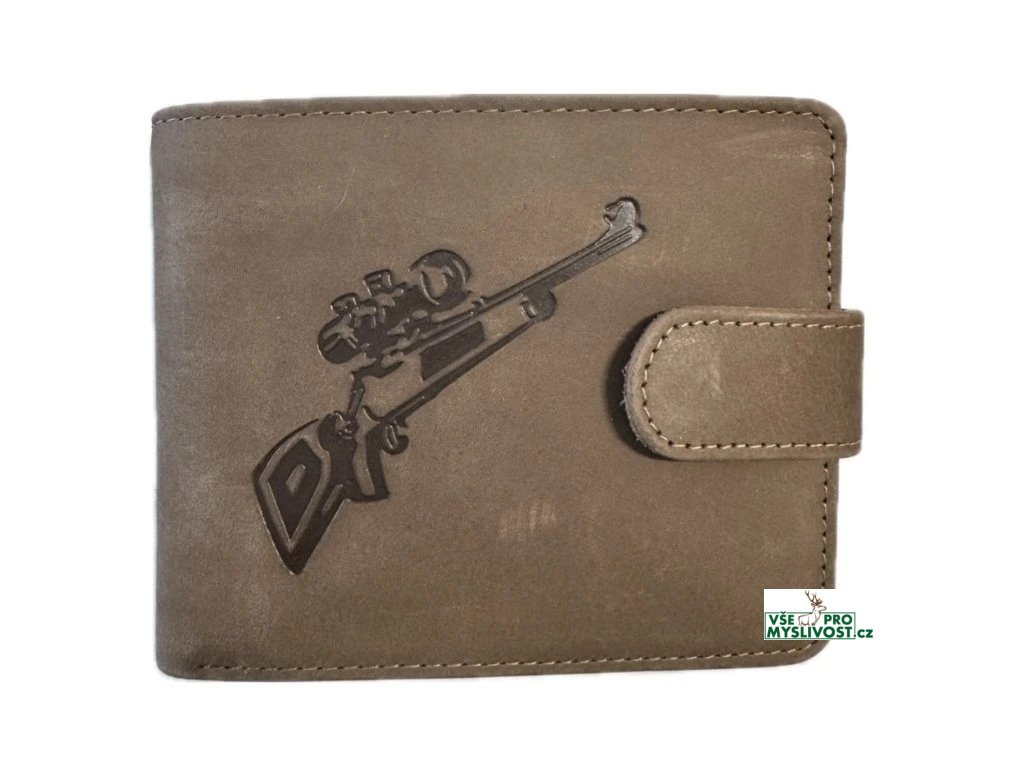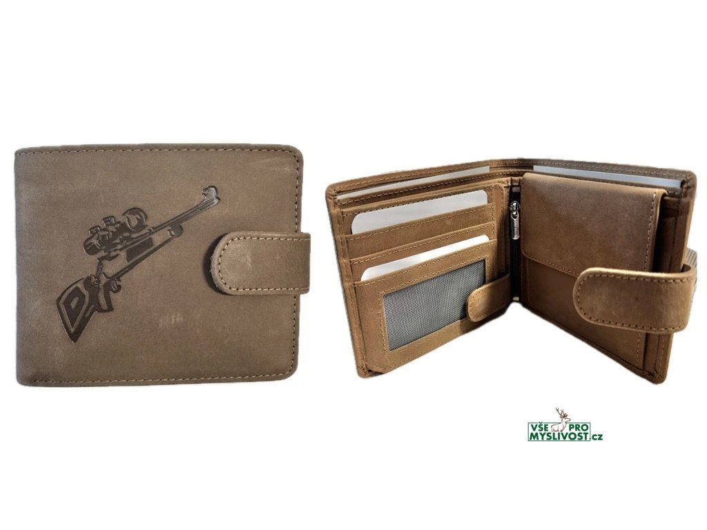 Peněženka je vyrobena z kvalitní broušené kůže s mysliveckým motivem. Peněženka má rozměry 13 x 10 cm a součástí balení je i krabička na tuto peněženku.