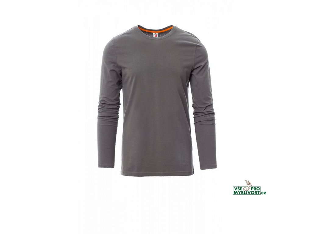 Pánské tričko s dlouhým rukávem a kulatým výstřihem, 1,5 cm pružný žebrovaný lem ze směsi spandex u krku s vrchním prošíváním na přední straně, barevně kontrastní vyztužovací páska od ramene k rameni viditelná na límečku, pružné švy, postranní sešití.