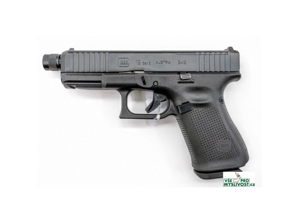 Varianta MOS FS se závitem na hlavni M13,5x1 levý. Nová Pistole GLOCK 19 Gen5 MOS má oproti předchozím generacím následující prvky/vlastnosti: Oboustranný záchyt závěru GLOCK MARKSMAN BARREL - Hlaveň s inovovaným vývrtem Nová povrchová úprava závěru a hlavně (nDLC) výhradně na pistolích Gen5 Na rámu bylo odstraněno tvarování pro prsty Rozšířená spodní část zásobníkové šachty pro pohodlnější vkládání zásobníku GLOCK FS = Front serrations! Přední drážky závěru (FS) zlepšují možnosti manipulace pistolí Glock. Díky drážkám můžete snadno provádět fast press check před a po střelbě. GLOCK Modulární Optický Systém (MOS): Modulární optický systém je konfigurace pistole, která umožňuje pomocí různých adaptérů montáž optických systémů přímo na závěr pistole. Sada adaptérů se skládá ze čtyř očíslovaných variant pro následující optické systémy: (01) Docter, Meopta, Insight (02) Trijicon (03) C-More (04) Leupold
