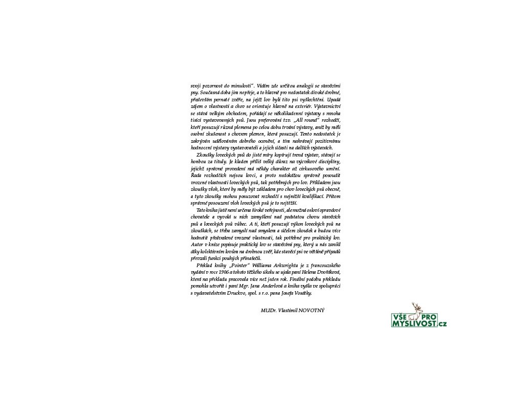 V úvodu knihy kynolog, iniciátor a mecenáš tohoto vydání MUDr. Vlastimil Novotný uvádí: „Tato kniha jistě není určena široké veřejnosti, ale možná osloví opravdové chovatele a vyvolá u nich zamyšlení nad podstatou chovu stavěcích psů a loveckých psů vůbec.