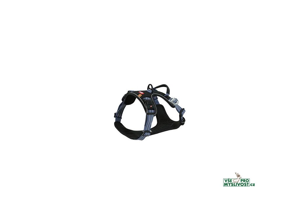 Postroj pro psa s bezpečnostními přezkami.