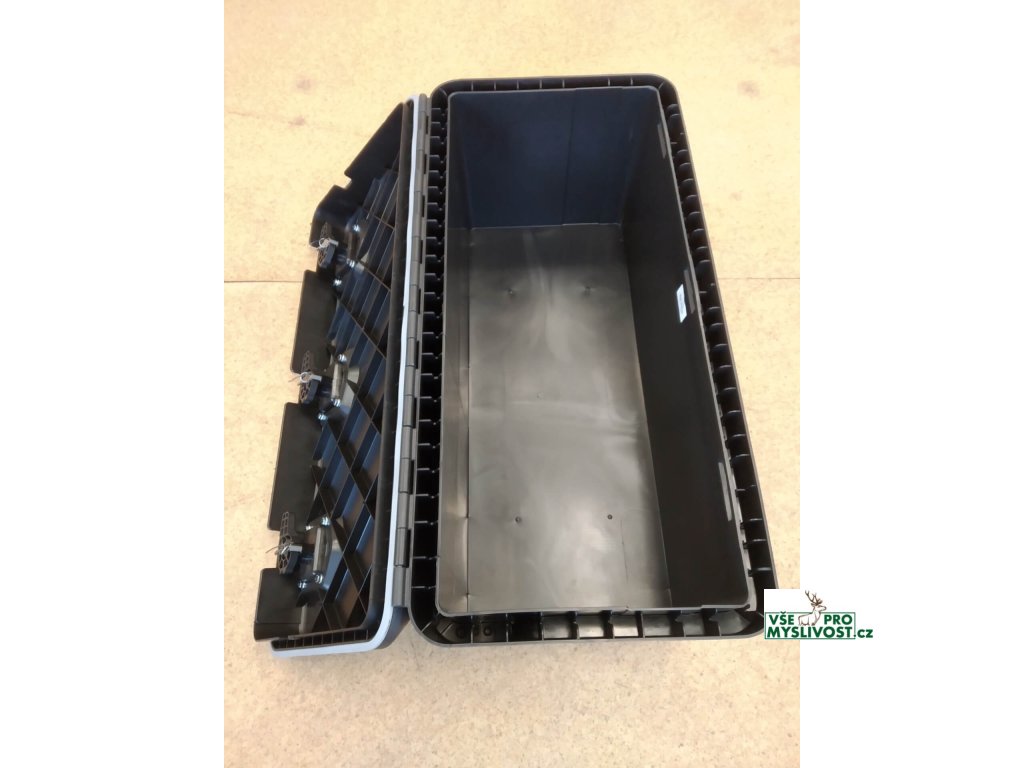 Přepravní box, vhodný ke kombinaci s našimi nosiči o min. rozměru ložné plochy 100×50cm, uzamykatelný na třech zámcích, z pevného plastu.