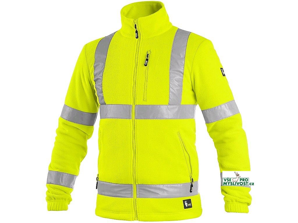 Pánská výstražná fleecová bunda s reflexními pruhy. Rukávy do gumy, boční i náprsní kapsy na zip, stahování v dolním okraji, podšívka ze síťoviny. Doporučené použití: stavebnictví, silničáři, řidiči, letecká a lodní doprava, logistika, řidiči kamionů, policie, záchranáři.