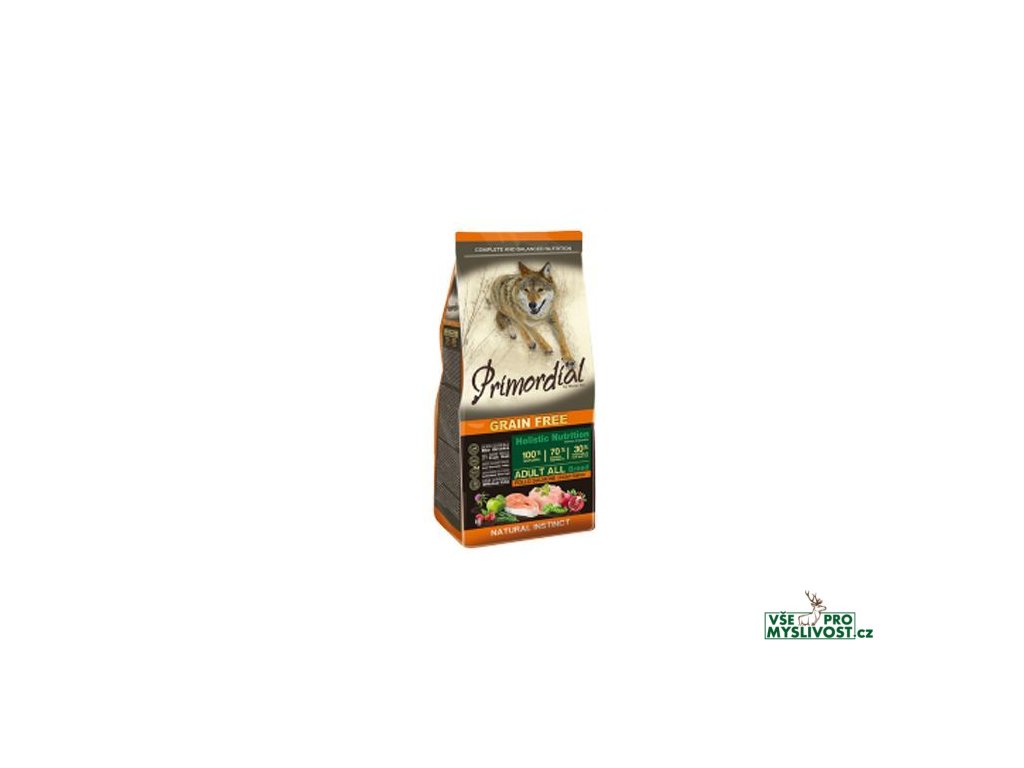 Primordial kuře a losos je kompletní bezobilné vysoce stravitelné krmivo bohaté na proteiny vysoké biologické hodnoty a obsahuje vhodnou kompozici aminokyselin. Kuřecí maso, striktně z volného výběhu, poskytuje snadno stravitelné bílkoviny a atraktivní chuť, kterou psi milují. Losos, jako všechny ryby, je bohatým zdrojem omega 3 mastných kyselin, které vykonávají důležitou kosmetickou funkci pro kůži a srst a jsou velmi prospěšné pro kardiovaskulární systém (srdce a cévy). Dále je bohatý na minerální soli a jeho bílkoviny jsou snadno stravitelné. Ovoce a zelenina bohaté na vitaminy, minerály a fytonutrienty, trávicí vlastnosti jablka, antioxidační funkce granátového jablka a šípku a podpora jater ze strany ostropestřce dodávají tomuto krmivu dokonalou rovnováhu chuti a živin. Jedná se o skutečně holistický produkt, který aktivně přispívá k celkovému zdraví psa.