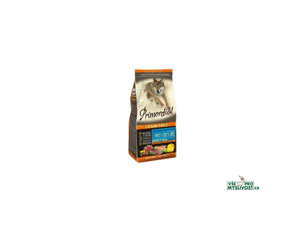 Primordial pstruh a kachna je kompletní vysoce stravitelné krmivo bohaté na proteiny vysoké biologické hodnoty a obsahuje vhodnou kompozici aminokyselin. Kachní maso, striktně z volného výběhu, poskytuje kompletní bílkoviny a atraktivní chuť, kterou psi milují. Pstruh, ryba žijící pouze v čistých a čirých vodách, nabídne snadno stravitelné bílkoviny a je bohatý na omega 3 mastné kyseliny, které vykonávají důležitou kosmetickou funkci pro kůži a srst a jsou velmi prospěšné pro kardiovaskulární systém (srdce a cévy). Ovoce a zelenina bohaté na vitaminy, minerály a fytonutrienty, trávicí vlastnosti ananasu, antioxidační funkce granátového jablka a šípku a podpora jater ze strany ostropestřce dodávají tomuto krmivu dokonalou rovnováhu chuti a živin. Jedná se o skutečně holistický produkt, který aktivně přispívá k celkovému zdraví psa.