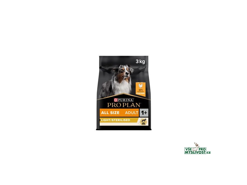 PRO PLAN Adult All size Light or Sterilised s OPTIWEIGHT pro všechna plemena psů s nadváhou nebo po kastraci. Granulované krmivo s obsahem kuřete. Krmivo obsahuje rybí tuk, který má blahodárné účinky na činnost srdce, mozku a také podporuje zrak. Správným dávkováním lze docílit nižší hmotnosti a také jejímu udržení, případně lze zabránit vzniku nadváhy.Tato receptura nahrazuje: Pro Plan Light Original Chicken a Pro Plan Sterilised Original Chicken