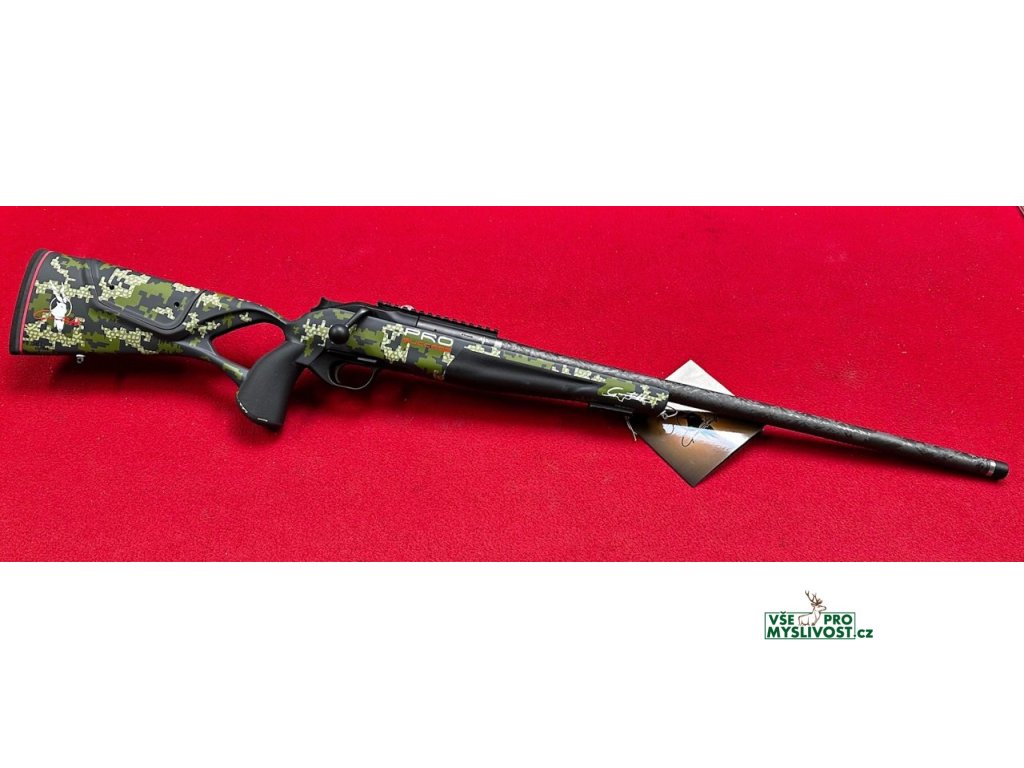 Zakázkové provedení zbraně s carbonovou pažbou Gustaff PRO Success s ruční aplikací camo povrchové úpravy a řadou extra prvků (stavitelná lícnice, lišta pro dvojnožku, loga), carbonovou hlavní Proof Research se závitem M17x1mm, spouští ATZL a integrovanou, pebnou základnou Weaver/Picatinny s náklonem 20 MOA