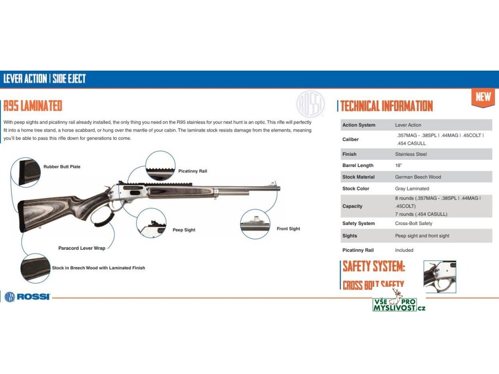 Puška opak. Rossi, Mod: R95 Laminated, Ráže: .357 Mag., hl: 18" (458mm), 8 ran, nerez