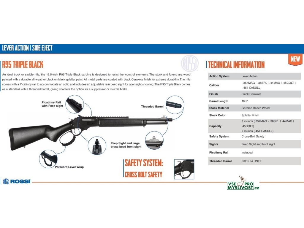 Puška opak. Rossi, Mod: R95 Triple Black, Ráže: .44 RemMag, hl: 16,5" (419mm), 8 ran,černá