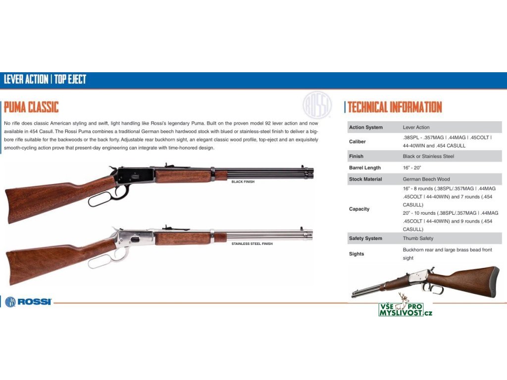 Žádná puška nemá klasický americký styl a rychlou a lehkou ovladatelnost jako legendární Puma od Rossiho. Je postavena na osvědčeném pákovém mechanismu modelu 92 a nyní k dispozici v ráži 454 Casull. Rossi Puma kombinuje tradiční německou pažbu z tvrdého bukového dřeva s modrou nebo nerezovou povrchovou úpravou a poskytuje velkou sílu. pušku vhodnou do zapadlých lesů nebo na čtyřicítku. Nastavitelné zadní hledí, elegantní klasický dřevěný profil, horní výhoz a výtečně řešená muška. hladký chod zbraně dokazují, že současná technika se může snoubit s osvědčeným designem.