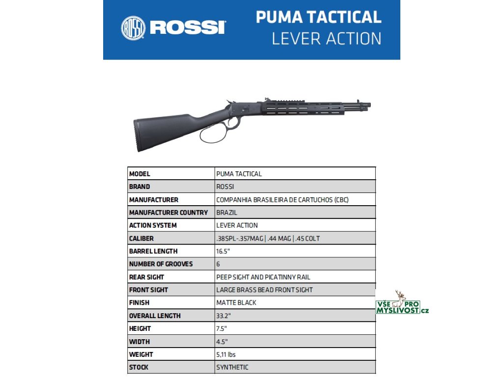 Rossi PUMA Tactical je nová taktická verze známé PUMA platformy: páková opakovací kulovnice s M-LOK předpažbím, integrovanou základnou pro montáž s možností osazení dioptru a závitovanou hlavní připravenou pro montáž tlumiče.