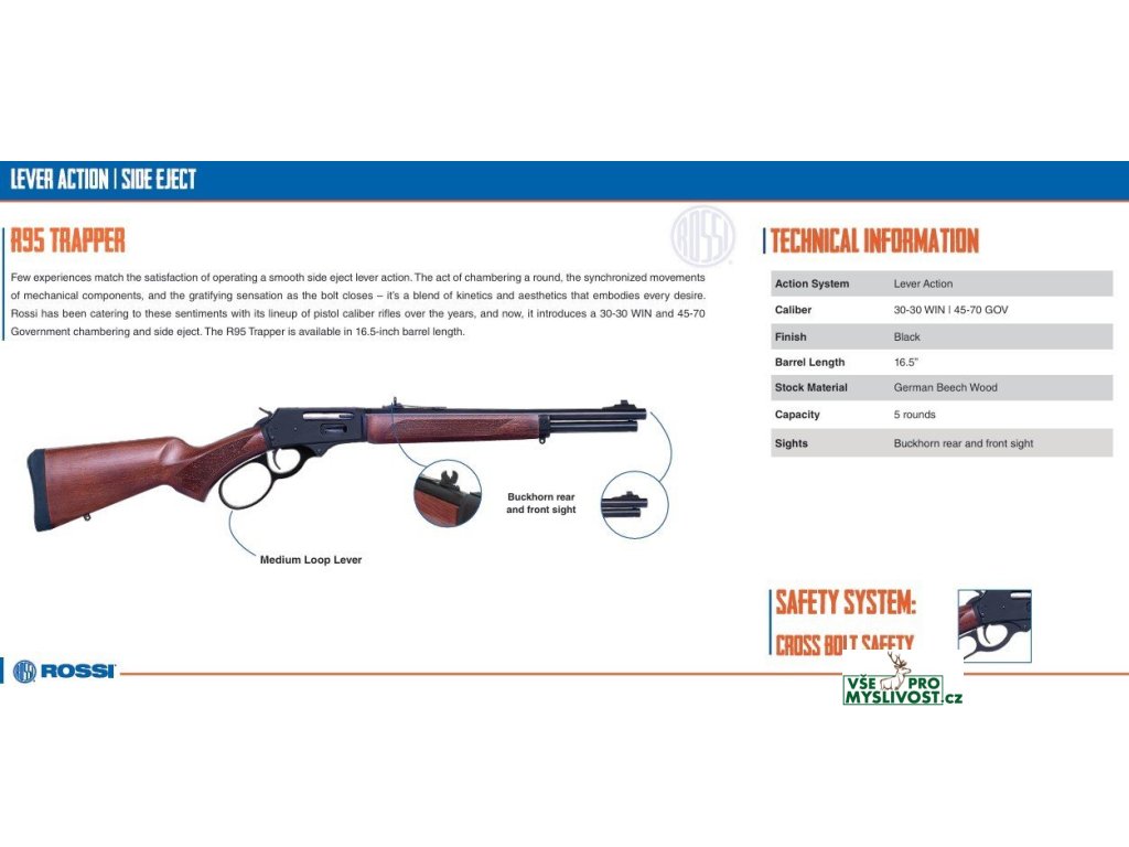 Jen málokterý zážitek se vyrovná uspokojení z ovládání pákové zbraně s plynulým bočním výhozem. Samotný akt nabíjení náboje, synchronizované pohyby mechanických součástí a uspokojivý pocit při zavírání závěru - to je směs kinetiky a estetiky, která ztělesňuje všechny touhy. Společnost Rossi již léta vychází vstříc těmto pocitům svou řadou pušek pistolových ráží a nyní představuje pušky populárních rážích 30-30 WIN a 45-70 Government s bočním výhozem. R95 Trapper je k dispozici s délkou hlavně 16,5 palce.